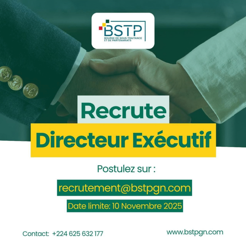 Dans le cadre du renforcement de la politique de contenu local en Guinée, la Bourse de Sous-Traitance et de Partenariats (BSTP) recherche un leader stratégique et opérationnel pour diriger son équipe, piloter la croissance et consolider les partenariats avec le secteur privé, les PME et les institutions publiques.