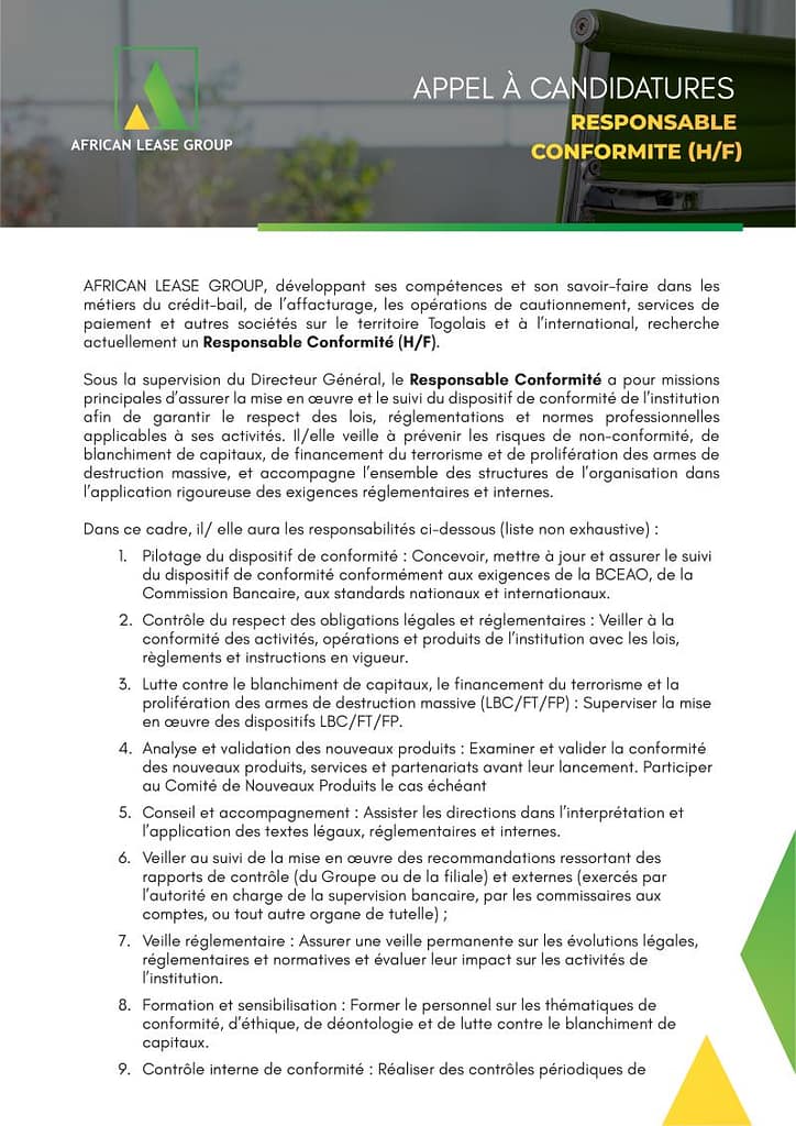 Acteur panafricain présent dans plusieurs pays de l’UMOA, intervenant dans le crédit-bail, l’affacturage, les opérations de cautionnement et les services de paiement, nous recherchons un(e) Responsable Conformité pour piloter et structurer l’ensemble du dispositif conformité du Groupe.