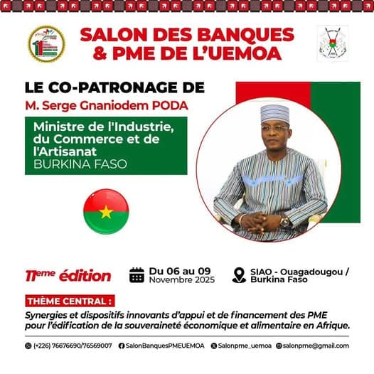 Du 6 au 9 novembre 2025, Ouagadougou accueille la 11ème édition du Salon des Banques et PME de l’UEMOA sous le Co-Patronage de M. Serge Gnaniodem PODA, Ministre de l’Industrie, du Commerce et de l’Artisanat.