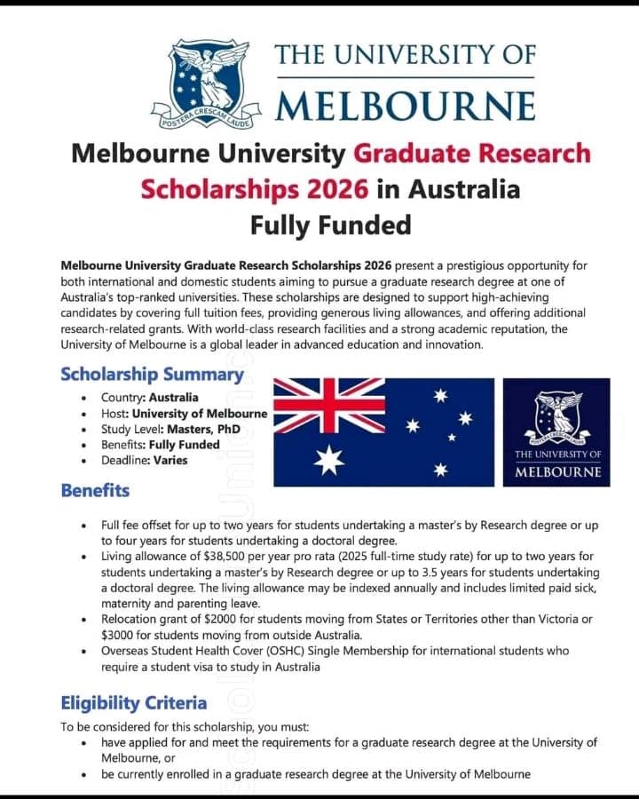 - Avoir postulé et satisfaire aux exigences d’un diplôme d’études supérieures en recherche à l’Université de Melbourne, ou