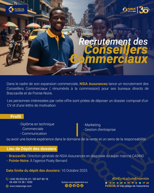 Dans le cadre de son expansion commerciale, NSIA Assurances recrute des Conseillers Commerciaux (rémunérés à la commission) pour ses bureaux directs de Brazzaville et Pointe-Noire.