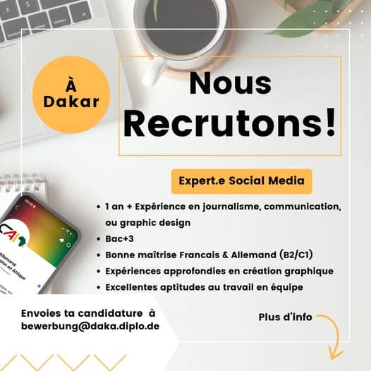 L’Ambassade de la République Fédérale d’Allemagne à Dakar recherche, dès que possible, un(e) expert(e) en réseaux sociaux pour le Centre Allemand d’Information en Afrique.