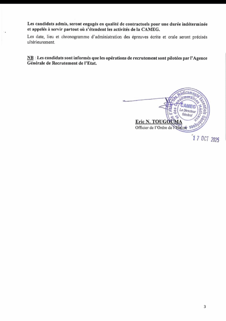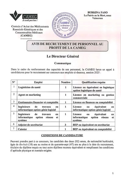 Dans le cadre du renforcement des capacités de son personnel, la CAMEG lance un appel à candidatures pour le recrutement sur concours aux emplois ci-dessous, session 2025: