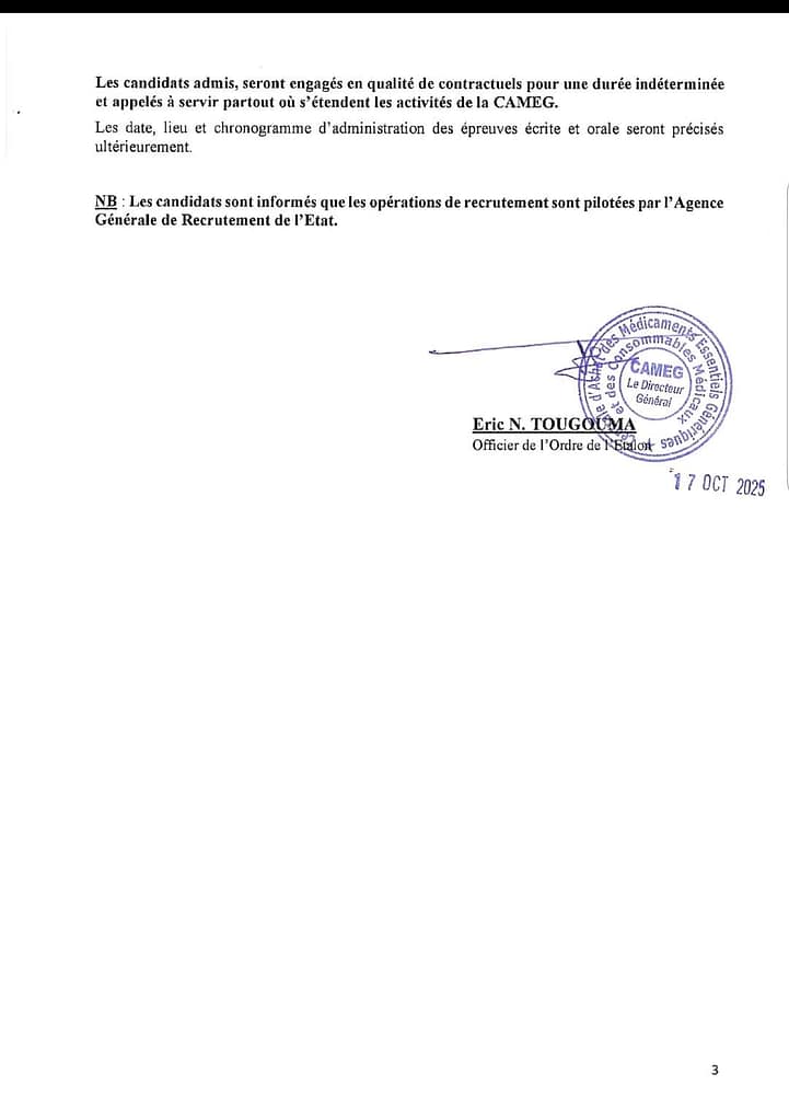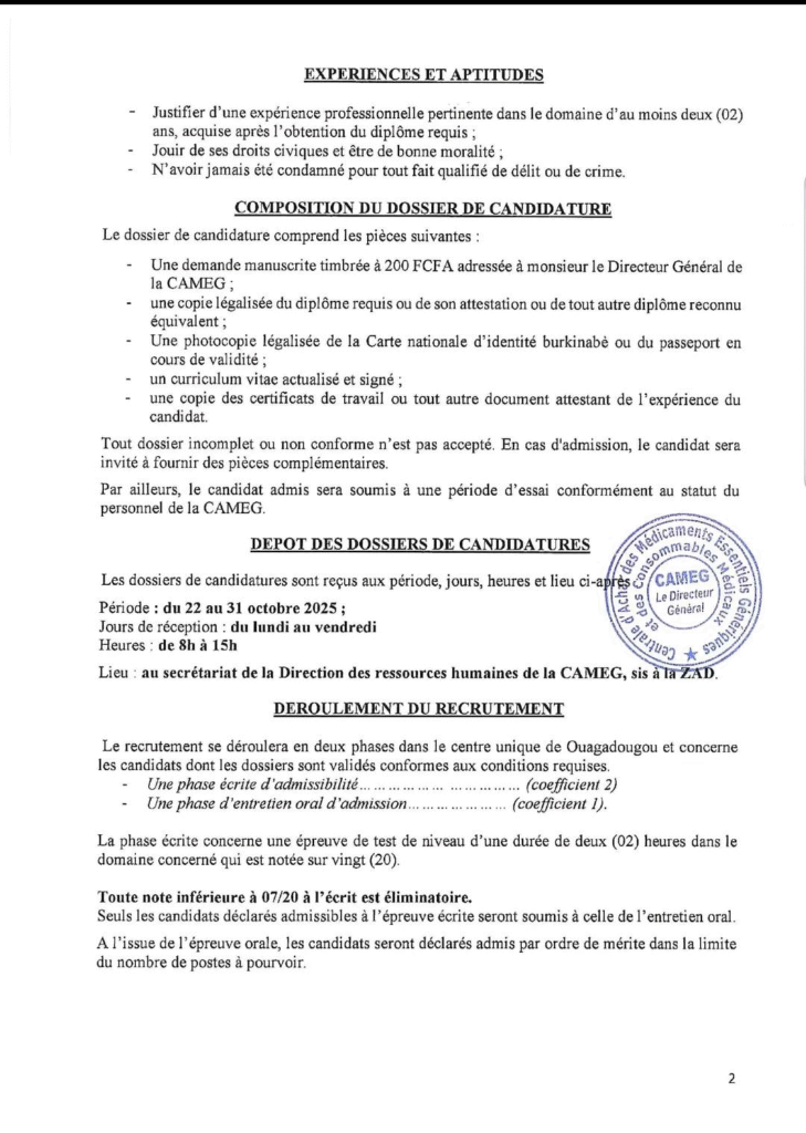 • Lieu : au secrétariat de la Direction des ressources humaines de la CAMEG, sis a la ZAD