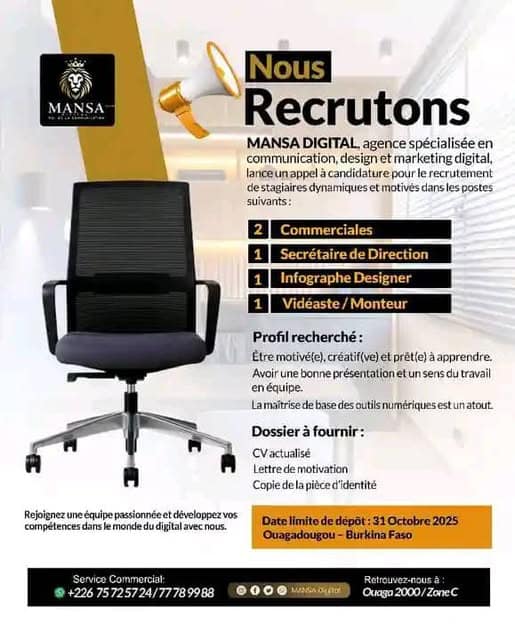 MANSA Digital recherche des candidatures pour le recrutement de stagiaires conformément au tableau ci-dessous :