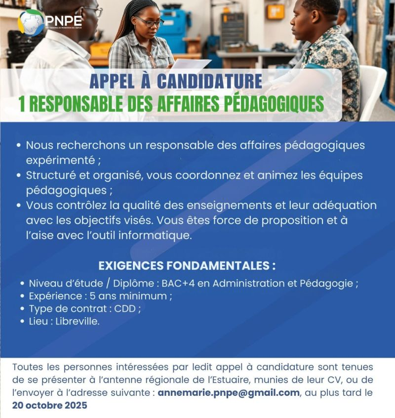 présenter à l’Antenne Provinciale de l’Estuaire munies de leur CV ou de l’envoyez par mail à l’adresse annemarie.pnpe@gmail.com, au plus tard le 20 Octobre 2025.