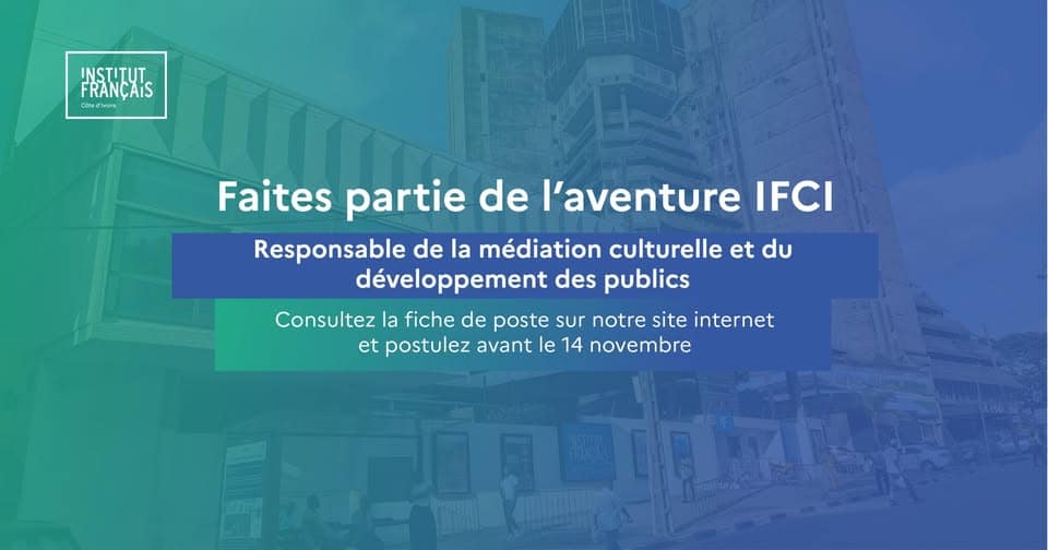 Date de prise de fonction prévisionnelle : 05/01/2026 RECRUTEMENT : Le.a candidate sera recrutée au terme d’une commission de sélection, sur la base d’un dossier de candidature (CV, lettre de motivation et photocopie du diplôme universitaire requis) à l’attention de la Directrice de l’Institut français de Côte d’Ivoire en précisant dans l’objet du message « Responsable de la médiation culturelle » à l’adresse suivante : recrutement@institutfrancais.ci