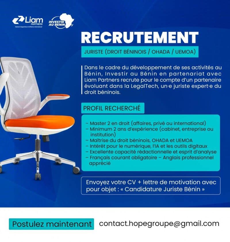 Investir Au Bénin , en partenariat avec Cabinet LIAM Partners ,recrute un(e) Juriste expert (e) pour le compte d’une entreprise internationale qui s’implante au Bénin 📍🇧🇯