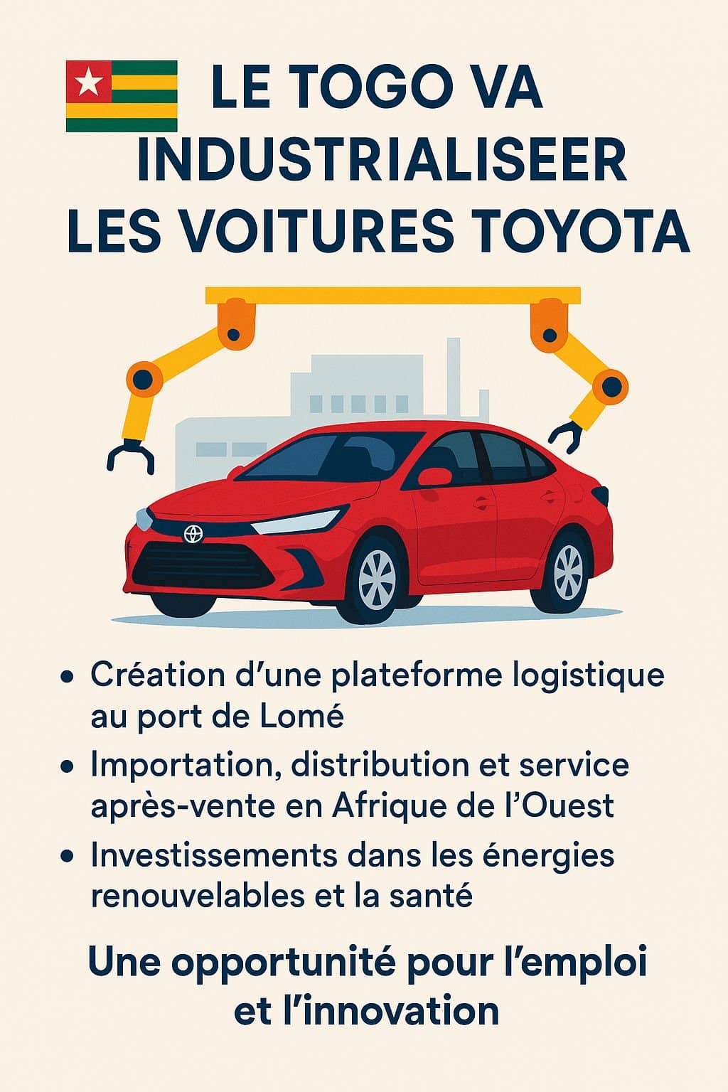 Le Togo, un pays d’Afrique de l’Ouest, a récemment fait des avancées significatives dans le domaine de l’industrialisation, en particulier avec l’implantation d’une usine Toyota. Cette initiative vise à renforcer l’économie locale et à créer des emplois grâce à une production automobile durable.