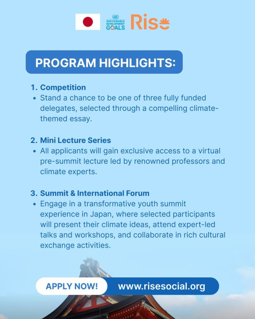 Are you a passionate youth aged 19–35 from anywhere in the world, ready to bring your climate ideas to an international stage? This is your chance to join the Rise Young Leaders Summit Japan 2025 — and possibly win a fully funded trip to Japan!